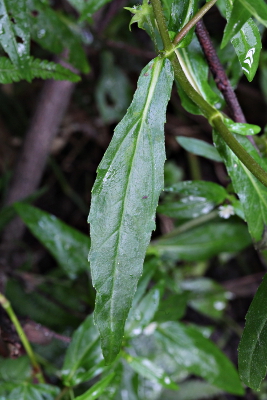 | 身近な植物として野草図鑑などで紹介されることの多いタカサブロウですが、じつは水田わきなどで目にするタカサブロウは、ほぼすべてアメリカタカサブロウに置きかわっていて、在来のタカサブロウは有機農業を行っている谷戸田のような限られた環境に残るのみです。タカサブロウの葉はやや幅広で、鋸歯が鈍頭ではっきりしないのに対し、アメリカタカサブロウでは明確な鋸歯があることや、種子が細身で上側が角ばっているのが特徴ですが、中間的なものもあって悩ましいところです。 | |
