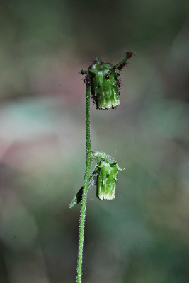 | 観光地方面への行き帰りは渋滞につかまりやすく、この日は、混む前にと早起きしてでかけました。現地でテイショウソウを撮影していると、散策路の土手でヒメガンクビソウが咲いているのに気づきました。へら状の葉が地表近くでロゼット状に広がるのが特徴で、頭花はこの仲間では最も小さく、直径は4mmほどしかありません。頭花はうつむいたように下向きにつき、その数も2〜3ぐらいなので、どこかさびしげなようすです。関東地方以西に分布し、山地のうすぐらい樹林下でぽつぽつと生えます。 | |