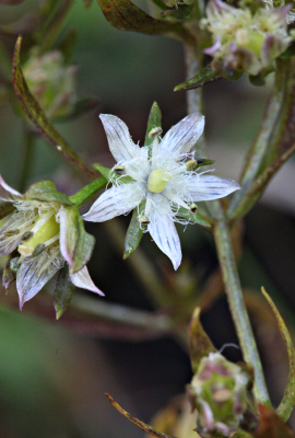 | イヌセンブリは明るい湿地を好み、どちらかといえば乾いた裸地のようなところに生えるセンブリとは生育環境が異なります。分布は本州〜九州と広いものの、関東地方では少なく、神奈川県では2ヶ所しか記録がありません。条件がよいとセンブリより大きくなるらしく、ここではたくさんの花をつけて倒れぎみになっているものもありました。花は中心部にモジャモジャと生える毛が多く、花を見ればセンブリと違うとわかります。センブリのように苦くなく、薬用にならないことからこの名前があります。 | |