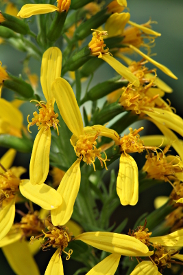 | メタカラコウは、名前に「雄」とつくオタカラコウにくらべて全体に小型で繊細なようすから「雌宝香」とついています。魚類や昆虫ではオスよりもメスの方が大型のものもあり(ひょっとするヒトでもそういう場合もあるかも知れません)、メスだから小型というのは必ずしも当てはまりません。舌状花が頭花の下側にかたよってつくことや、花茎が紫色になることから区別は容易です。三ツ峠山では北側の登山口から山頂へと向かう針葉樹林下で、霧ヶ峰では明るい草原で花を咲かせているのを見かけました。 | |
