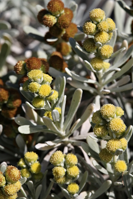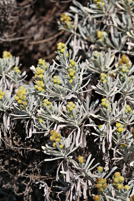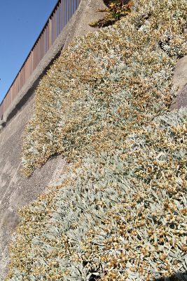 | モクビャッコウは主に中国南部から東南アジアの亜熱帯〜熱帯の隆起サンゴ礁に生え、日本では南西諸島などから知られます。キク科ではめずらしい木本で、厳しい自然環境への対応なのでしょう、全体が白い綿毛に覆われるのが特徴です。古くから園芸用途に栽培されてきたこともあり、盗掘などで数を減らしています。国内帰化として稲村ヶ崎海岸に栽培逸出することが「神奈川県植物誌2018」に掲載されており、現地を訪ねると、本来の環境に似るのかブロック岸壁の一面に群生していました。 | |