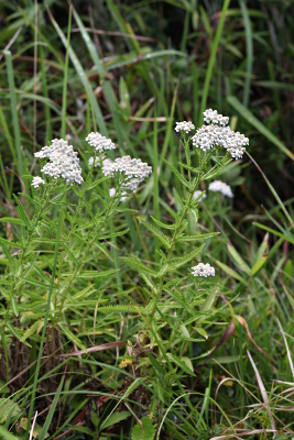 | ノコギリソウの仲間は、日本では山地の草原を主なすみかとする植物で、九州にはアソノコギリソウが、本州中部ではノコギリソウのほかヤマノコギリソウがそれぞれ同じような環境に生えます。葉は櫛の歯状に細かく切れこんでいて、「鋸草」の名前もこれに由来します。群生することは少なく、草のかげにまばらに咲くので地味な印象ですが、近縁のセイヨウノコギリソウでは花序全体の直径は10cmほどになり、園芸植物としても利用されています。 | |