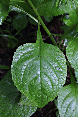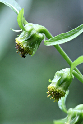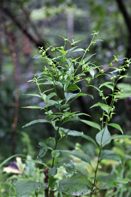 北海道に出向いた際、空き時間に札幌市郊外にある野幌森林公園を訪ねました。うす暗い林下の散策路を歩きはじめてすぐ、期待どおりにこの地の名を冠したノッポロガンクビソウが現れました。ガンクビソウの変種ですが、より大型で高さ1.5mにもなり、多く枝を分けて地味ながらたくさんの頭花をつけ、なかなか豪華な見栄えです。頭花の総苞片の長さがそろっていることや、下部の幅広の葉もノッポロガンクビソウの特徴です。北海道固有というわけではなく、近畿地方まで分布します。 | |