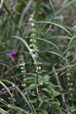 ひさびさに歩いた霧ヶ峰高原の八島湿原、この日は周回コースをぐるっと一周しました。満開のアサマフウロやマツムシソウの群落を見つつ、シカ侵入防止ネットをくぐった先の湿地わきで見かけたのがシロバナヤマハッカです。花色から同じシソ科のヒキオコシかと思いましたが、まわりに咲いているのはヤマハッカばかりで、近づいてみてヤマハッカの白花品とわかりました。ヤマハッカは花だけでなく萼片や茎も紫がかりますが、この個体は花冠だけでなく、全体に紫色が抜けて緑色となっています。 | |