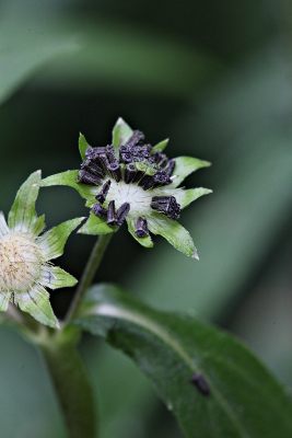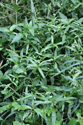 | タカサブロウは水田や湿地に生える1年草で、水稲の穂が黄金色に色づきだすころ、直径1cmほどの白い花をつぎつぎに咲かせます。水田雑草の常で、水稲の収穫が終われば一緒に鋤きこまれてしまいます。ところがそこはよくしたもので、早めに開花したものからこぼれ落ちた種子が散布され、翌年の発芽、生長につながっていきます。水稲の伝搬とあわせて持ちこまれた史前帰化植物とされますが、最近ではアメリカタカサブロウにおされてしまい、よほど注意して確認しないと気づけません。 | |