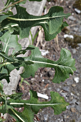 | どういうわけか、車を走らせていると道路わきでチラチラ見かけるのがトゲチシャです。停める場所がなかったり、花期を過ぎたりして、カメラを向ける機会がないままでした。このときは幸い、黄色い花を咲かせているのが目に留まりました。ユーラシア原産の1年草で、高さ1m前後、夏に円錐花序を上向きに広げ、直径1cmほどの頭花をつけます。どうも1日花らしく、蕾は多数あっても開花しているのはパラパラ、といったようすです。茎や葉裏にトゲが多く、名前もこれに由来します。 | |
