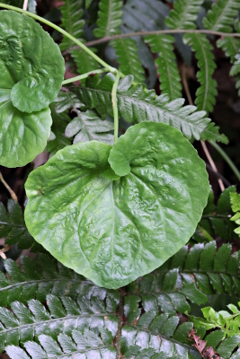 | 以前から宿題となっていたツルギキョウですが、この年の秋、週末に時間がとれるのが10月も中旬となってしまい、まだ咲いているか不安になりながらも現地に足を向けてみました。岩がちの斜面に垂れさがるスペード型のツルギキョウの葉が見つかったものの、すでに果実となっているものばかりです。一つだけ満開の花が残っていてひと安心しました。キキョウ科にはめずらしくつる性で、葉のつけねに一つつく花のサイズは1cmほど、関東以西に分布しますが、希少な種類といえます。 | |