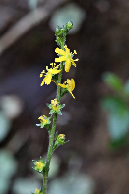 | 神奈川県と静岡県をむすぶ乙女峠は、静岡県側に下ると目の前には富士山が広がって、なかなか見晴らしのよいところです。この日は反対側の箱根の仙石原方面へと下りました。赤土の露出した登山道を進むと、ヒメキンミズヒキがちょうど満開となっていました。ヒメキンミズヒキはキンミズヒキに似ていますが、ずっと小さく、高さは50cmぐらいにしかなりません。また、葉は下の方にかたまってつくのが特徴です。一つ一つの花も小さく、花弁もほっそりとしていて、繊細な印象です。 | |