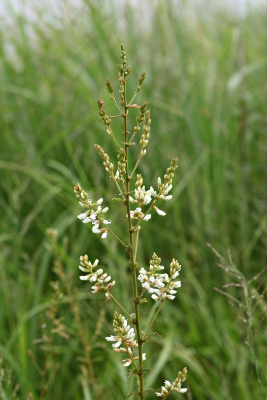 植物名で「犬」と「猫」がそろうものは意外と少なく、ハギ属以外ではイヌコリヤナギとネコヤナギがあるヤナギ属くらいでしょうか。阿蘇でネコハギを見たときから、「いずれイヌハギも」と思いつつ、先延ばししていました。お盆のころに咲くということで訪ねた富士山麓の草原では、ススキ原に隠れるようにイヌハギが点々と花をつけていました。大きいものは1mを超え、いくつも枝分かれした花序の先に総状に白い花を咲かせ、ピークを過ぎると葉のつけねに閉鎖花をつける特徴があります。 | |