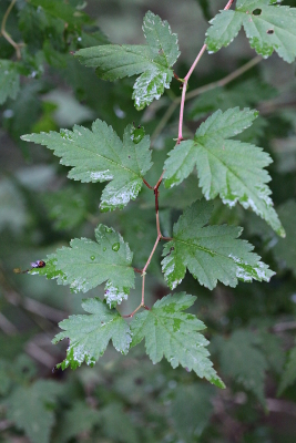 | 「ウツギ」の名前がつくバラ科の植物にコゴメウツギがあります。ウツギと同じようなところに生えて小さな白い花をたくさんつけることからこの名がつきました。たしかにウツギに似た雰囲気ですが、するどい鋸歯のある葉は全く異なります。白い花弁と、黄色い花の中心部の色があわさって、花序は遠くから見るとクリーム色に見えます。自宅近くの丘陵を散策していると、雑木林のふちで満開のコゴメウツギが突然現れました。予想していなかった出会いは、めずらしなくてもうれしいものです。 | |