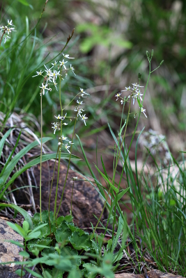 高山に生えるユキノシタ科の植物は、クロクモソウやクモマグサなど、多少なりとも湿りけのあるところに生えるものが多く、ミヤマダイモンジソウもその例外ではありません。母種のダイモンジソウは山地の岩場が主なすみかですが、その高山型であるミヤマダイモンジソウの生育環境は湿った草地です。花茎を直立し、先端に白い花をつけますが、花はダイモンジソウのような均整のとれた「大の字」になることは少なく、花弁の長さはバラバラである場合が多いようです。 | |