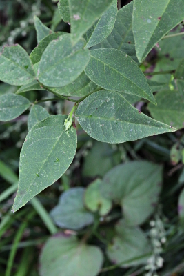| この日、ヤブマメの撮影後、散策路に沿って広町緑地の奥に進んでいくと、日当たりのよい草地に咲くナンテンハギが現れました。その名前は葉のかたちがメギ科の木本のナンテンに似ていることからついたものです。葉の先端に頂小葉がつく奇数羽状複葉が多いマメ科の中にあって、頂小葉がない点がナンテンハギのわかりやすい特徴です。実はこれは本当の偶数羽状複葉ではなく、本来まきひげになるべき頂小葉がナンテンハギでは発達しないため、一見すると偶数羽状複葉に見えるものです。 | |