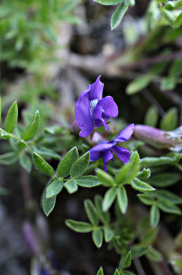 7月はじめ、本州の高山の稜線は雪が消えたばかりで花も多くありません。それでも雪が積もらず、晴れれば温まりやすい岩のすきまでは、イワウメやオヤマノエンドウがはやくも花を咲かせ、まだ冷たい風にゆれているのをみることができます。オヤマノエンドウは岩場や砂礫地にはりつくようにして葉を広げ、青紫色の花をつけます。花のあとには花から想像できない大きな果実をつけます。赤岳山頂への最短ルートの文三郎道では、満開となったオヤマノエンドウを見つけることができました。 | |