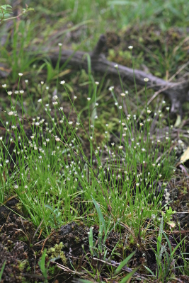ホシクサ属は頭花が丸く、総苞がめだたないグループと、頭花はひっくり返した円錐状となり、長くのびた総苞片が放射状に広がるグループに分かれます。イヌノヒゲは後者の代表といえ、高さ5〜10cmの1年草で、日当たりのよい湿りけのある環境に生えます。名前もこの総苞片をイヌノヒゲにたとえてついたものといいます。葉は株もとにロゼット状に広がります。撮影した場所は山地の稜線で砂礫地が広がっていましたが、雨や霧で水分が供給されるのか、イヌノヒゲが群生していました。 | |