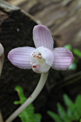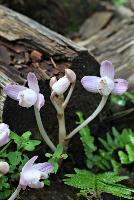 従属栄養性のランとしてよく知られるものの一つにショウキランがあります。山地の樹林下に生え、7月ごろに地中から花茎を持ちあげて淡紅色の花をつけます。光合成を行わないわりには花の直径は3cmほどとかなり大きく、生長のよいものでは10ちかい数の花を咲かせるものもあります。葉がない上、太くて白い茎がキノコを連想させるらしく、写真のショウキランを撮影しているときも、登山客から「何というキノコですか」と声をかけられました。 | |