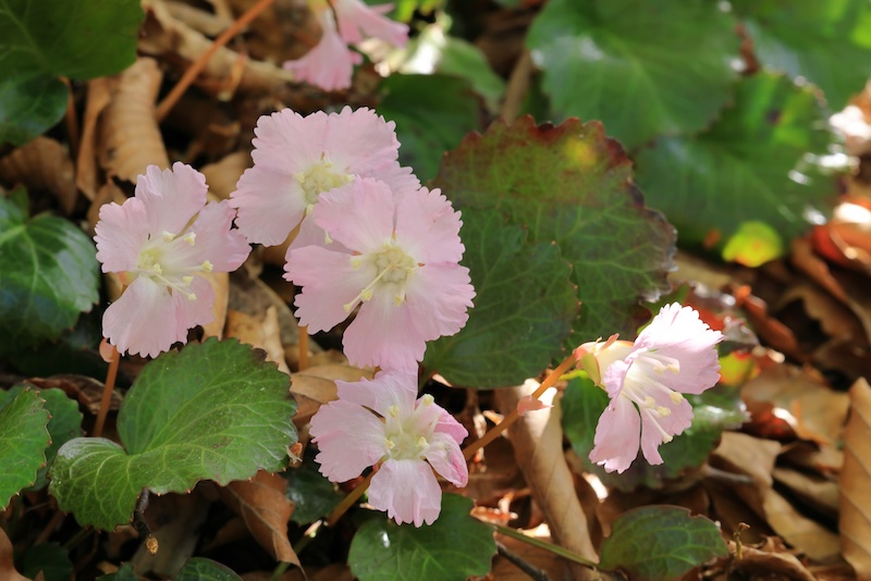 2025年5月21日 福島県 撮影 bergさん イワウチワは分布域は広いのですが、あるところには群生するのに、生えている 場所は限られているという印象があります。bergさんのご指摘のとおり、ふつうは 1株に咲いている花は1〜2輪ですが、これだけつくと花束のように華やかです。 |