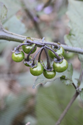 | イヌホオズキと名のつく帰化植物は、アメリカイヌホオズキなど3種類が知られていますが、よく似ていて同定しにくいグループです。くわしくはHP「石川の植物」をごらんいただければと思いますが、アメリカイヌホオズキは、花序は花の数が1〜4と少なくて散状(節間がのびず、花が1ヶ所から放射状に広がってつく)になることと、果実に「球状顆粒」があるのが特徴とされるほか、葉のふちが浅く切れこむことが多いようです。花序は総状ぎみのものもあって、総合的に判断する必要があります。 | |