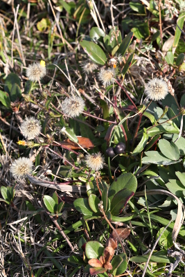 | ハマコウゾリナはコウゾリナの海岸型で、千葉県から静岡県まで知られており、ワダンやイソギクと似た分布をしています。三浦半島では数は少なく、岩場の草つきでわずかに見られる程度です。コウゾリナとのちがいは草丈が低いことのほか、コウゾリナの根生葉は花のころには枯れてしまうのに対し、ハマコウゾリナの根生葉は花が終わる秋まで残るところです。花はコウゾリナよりもやや小さめで、頭花の直径は1.5〜2cmくらいです。2年越しの再訪で、ようやく開いた花を見ることができました。 | |