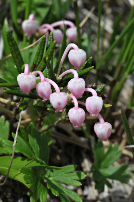 6月の尾瀬ヶ原をいろどる植物の一つとして、ヒメシャクナゲがあげられます。ミズバショウやリュウキンカの花が終わったころ、ミズゴケでおおわれた湿原で薄桃色をした壺型の小さな花を咲かせます。高さ20cmほどの常緑の矮性低木で、湿りけのあるところがよほど好きらしく、中には半分ほど水につかっているものもあります。葉は細長く裏側に丸まっており、葉のかたちがシャクナゲに似ていることが名前の由来になっています。尾瀬ヶ原では数が多いだけに、よく探すと白花も見つかります。 | |