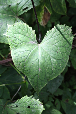 | メタカラコウは、名前に「雄」とつくオタカラコウにくらべて全体に小型で繊細なようすから「雌宝香」とついています。魚類や昆虫ではオスよりもメスの方が大型のものもあり(ひょっとするヒトでもそういう場合もあるかも知れません)、メスだから小型というのは必ずしも当てはまりません。舌状花が頭花の下側にかたよってつくことや、花茎が紫色になることから区別は容易です。三ツ峠山では北側の登山口から山頂へと向かう針葉樹林下で、霧ヶ峰では明るい草原で花を咲かせているのを見かけました。 | |