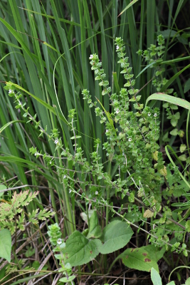 コゴメグサの仲間はミヤマコゴメグサなど多くの種類がありますが、主なすみかは高山で一部が亜高山帯の沢ぞいや林道に下りてきているという印象です。その中にあって高原の草地や砂礫地などを生育場所としているのがタチコゴメグサです。他のコゴメグサに比べると草丈は高く花はまばらにつくためか、貧弱な印象がありますが、実際は花の大きさは他の種とあまり変わらないようです。鳳凰三山へと向かう途中、あまり使われない登山道に足を向けてみると、タチコゴメグサの群生に出会いました。 | |