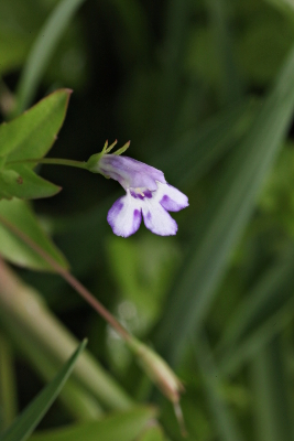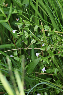 | 水を落とす前の真夏の水田をのぞくと、さまざまな雑草が水稲の株元に生えているのに気づきます。そのなかに3種類のアゼナがあって、在来種のアゼナのほか、いちばん目にすることが多いのが北米原産のタケトアゼナです。アゼナややはり帰化種のアメリカアゼナとちがい、葉のつけねがくさび形でなく、丸い形になるほか、花の長さは1cmほどとやや大きめで、多くの場合、白地に紫色の縁取りのようなもようがついているのが特徴です。名前は人名のように思えますが、由来は不明です。 | |