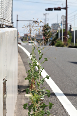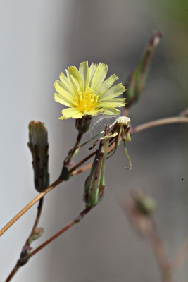 | どういうわけか、車を走らせていると道路わきでチラチラ見かけるのがトゲチシャです。停める場所がなかったり、花期を過ぎたりして、カメラを向ける機会がないままでした。このときは幸い、黄色い花を咲かせているのが目に留まりました。ユーラシア原産の1年草で、高さ1m前後、夏に円錐花序を上向きに広げ、直径1cmほどの頭花をつけます。どうも1日花らしく、蕾は多数あっても開花しているのはパラパラ、といったようすです。茎や葉裏にトゲが多く、名前もこれに由来します。 | |