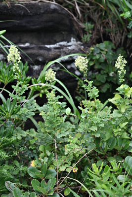 | アキカラマツは、カラマツソウの花が終わり、秋風が吹くようになったころに咲くカラマツソウの仲間で、生育環境はカラマツソウに似て平地から高原までと幅広いですが、花の花糸がカラマツソウのように丸くつくことはなく、重そうに垂れ下がるのが特徴です。都市近郊でも自然度の高い草地や湿地などではわりあいに見ることができます。8月下旬、三ツ峠山の山頂を過ぎ、河口湖ロープウェイの駅に下る登山道を進んでいくと、中腹の樹木が刈られた場所ではアキカラマツが咲いていました。 | |