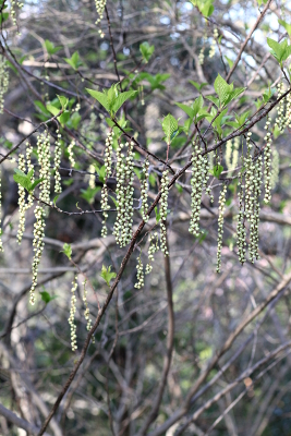 | キブシには花穂の長さや葉の大きさの違いなどからいくつかの変種があることが知られており、このうちエノシマキブシは、関東地方の海岸沿いに分布し、花穂が長く葉に光沢があって大きいのが特徴です。同じ特徴があるハチジョウキブシとは、分布のほか葉裏の脈に毛があることから区別されますが、それぞれ別の変種として分類するほどの違いとはいえないように思います。名前はもちろん、相模湾に浮かぶ小島でサザンオールスターズの歌などでよく知られている「江ノ島」に由来するものです。 | |