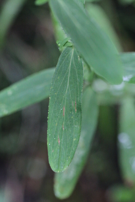 | 神奈川県西部から富士山周辺にかけての山地は、オトギリソウの種類が多いエリアといえるでしょう。オトギリソウのほか、やや小型のコオトギリやナガサキオトギリなどが知られています。このときは山の開けた草地でフジオトギリも現れました。オトギリソウの変種で叢生する特徴があるほか、母種の葉はつけねのほうが幅の広い広被針形なのに対し、フジオトギリの葉はより細長い線状長楕円形です。葉にはオトギリソウと同じく黒点が全体に散在し、この点でもコオトギリと区別できます。 | |