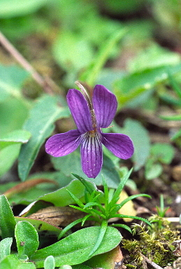 ヒメスミレが生えるのは道ばたや空き地など私たちの生活に身近なところで、都市部でも側溝のわずかなすきまで花をつけているほどです。タチツボスミレやスミレも人里に多いスミレですが、ヒメスミレの場合は両種のように山の中で見かけることはめったにありません。このようなことから、日本にもともと自生していたのではなく、人の生活とともにもたらされた植物の可能性も指摘されています。花は紫色の花のスミレの中でもっとも小さく、わずか1cmほどしかありません。 | |