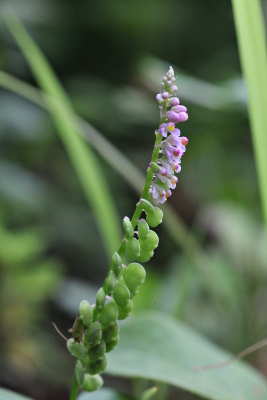 ヒナノキンチャは、財布などとして使われる「巾着」に果実が似ているというおもしろい特徴があるのが印象的で、図鑑などでその存在は以前から知っていました。ところがなかなか目にすることがなく、どうしてかと思っていたところ、ヒナノキンチャクもまた好石灰岩性の植物の1つらしく、「あるところにしかない」ようです。花序にたくさんならんだ果実は3mm、1つ1つの花はさらに小さくて2mmしかありません。初めて見る実物は図鑑の印象より小さく、高さ10cmもないものがほとんどでした。 | |