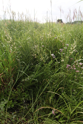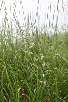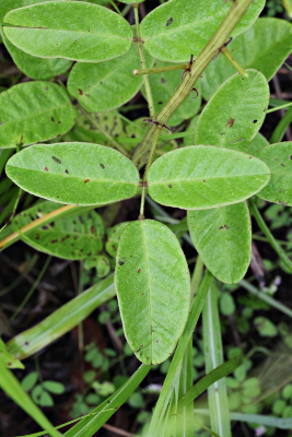 植物名で「犬」と「猫」がそろうものは意外と少なく、ハギ属以外ではイヌコリヤナギとネコヤナギがあるヤナギ属くらいでしょうか。阿蘇でネコハギを見たときから、「いずれイヌハギも」と思いつつ、先延ばししていました。お盆のころに咲くということで訪ねた富士山麓の草原では、ススキ原に隠れるようにイヌハギが点々と花をつけていました。大きいものは1mを超え、いくつも枝分かれした花序の先に総状に白い花を咲かせ、ピークを過ぎると葉のつけねに閉鎖花をつける特徴があります。 | |