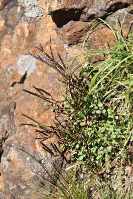 | 本州中部の高山に登りはじめたころ、至仏山とちがってさまざまな種類のアブラナ科の高山植物が生えていることにびっくりしました。ウメハタザオやクモマナズナとは葉のかたちがまったく異なり、羽状複葉になるミヤマタネツケバナでさえ最初は区別できなかったのですから、今にして思えば本当に初心者でした。ミヤマタネツケバナは雪田の周辺や湿った岩かげなどに生え、湿り気のあるところを好むところは同属のタネツケバナと似ており、全体のふんいきもあまり高山植物らしくありません。 | |
