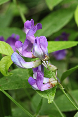 | この日、ヤブマメの撮影後、散策路に沿って広町緑地の奥に進んでいくと、日当たりのよい草地に咲くナンテンハギが現れました。その名前は葉のかたちがメギ科の木本のナンテンに似ていることからついたものです。葉の先端に頂小葉がつく奇数羽状複葉が多いマメ科の中にあって、頂小葉がない点がナンテンハギのわかりやすい特徴です。実はこれは本当の偶数羽状複葉ではなく、本来まきひげになるべき頂小葉がナンテンハギでは発達しないため、一見すると偶数羽状複葉に見えるものです。 | |