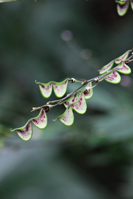| 9月初めに広町緑地を訪ねると、早くも秋の花が咲きはじめ、季節が移りはじめていることを感じさせました。いつもの散策路ではヌスビトハギが1mほどの高さにのび、長い花序を風にゆらせていました。秋の野山では、歩きまわっているうちにいろいろな植物の種子が衣服につくことがありますが、ヌスビトハギもその一つで、サングラスのようなかたちの長さ1cmほどのさやには、びっしりと小さなかぎ状の毛が生えていて、これで動物などにくっついて果実が運ばれるようになっています。 | |
