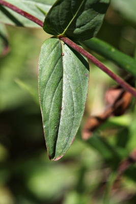 | オトギリソウはオトギリソウ科を代表する植物で、低山から亜高山にかけて生え、明るい草原などで見られます。この仲間の花弁や葉の縁には、明点・黒点と呼ばれる小さな丸い点があり、その場所や数の多少が同定のポイントになります。写真では明点・黒点を確認するのはむずかしいので、その場できちんと確認することが大切です。大きなものでは高さ50cmほどになりますが、上越国境の三国山の頂上付近では、吹きつける強い風のせいか、その半分ほどになったものをみかけました。 | |