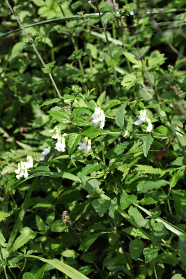 | ナンテンハギは水田と相性がよく、水田のなかには生えませんが、その法面の草地に群生するのをよく見かけます。日当たりがよいのと適度な水分供給がナンテンハギに好適なのでしょう。田畑まわりでは適度な草刈りによって草地が維持されることも多く、アキカラマツ、ワレモコウといった草地の植物や、フジタイゲキのように希少種が残される場合もあります。ここでは草斜面で点々とナンテンハギが花をつけるなかに、純白の花序が目立つシロバナナンテンハギもまとまって見られました。 | |