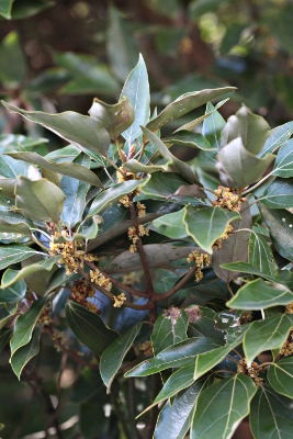 | 海岸草地で満開となったイソギクやハマラッキョウを観察し、車を停めた場所に戻って空を見上げると、シロダモが咲いているのがちょうど目に入りました。東北南部以西に分布する雌雄異株の常緑高木で、高さ15mにもなり、秋にたくさんの黄色い花を枝先につけます。光沢ある革質の葉は長さ15cmほどもあり、地上からだと表面がロウ質で白く見える葉裏が目立ちます。雌株の花は雄株よりも小さく、地味な印象ですが、翌秋には果実が赤く熟してよく目立ち、花と同時に見ることができます。 | |
