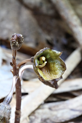 | 秋晴れの週末、新聞情報をもとにアキザキヤツシロランの撮影に丹沢山地の東麓まで出かけました。民家の竹林にある自生地を訪ねると、地表に積もった枯葉のすきまから緑褐色の花がいくつも顔を出していました。アキザキヤツシロランは腐生ランの一種で関東から九州まで分布し、花期は名前のとおり9〜10月とされています。観察したところ、すでに果柄を長くのばして果実となっているものもあり、花はいっぺんに咲くのではなく、つぎつぎに地中から花茎をのばして花をつけていくもののようです。 | |