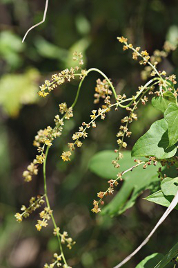 ヤマノイモ科は、ふだん目にするオニドコロやヤマノイモの細長いスペード形の葉のイメージが強いせいか、中部地方以西に分布するカエデドコロを初めて見たときは、図鑑で知っていたとはいえ、5〜9裂する深い切れこみの葉になんだか違和感を覚えたものです。この日は天山の稜線でキュウシュウコゴメグサやイナカギクを観察したあと、山頂を巻いてつけられた林道を歩いて登山口に戻る途中、カエデドコロが特徴ある葉と黄色味がかった花序をたくさん垂れ下げるのに出会いました。 | |