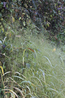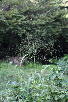 | キビはもっとも古く栽培されはじめた植物の1つとされ、東アジア〜中央アジアの温帯が原産といいます。このほかに食用とならない近縁野生種がいくつか知られていて、日本に広く分布するものとしてヌカキビがあります。田畑の周辺や空き地に生え、高さ1mほどになります。秋口に上がってくる円錐状の花序が特徴的で、左右に細い枝を伸ばし、先端に2つの小花からなる花穂をつけます。全体に弱々しい印象ですが、観察すると強風にも倒れることなく、花序をしなやかになびかせます。 | |